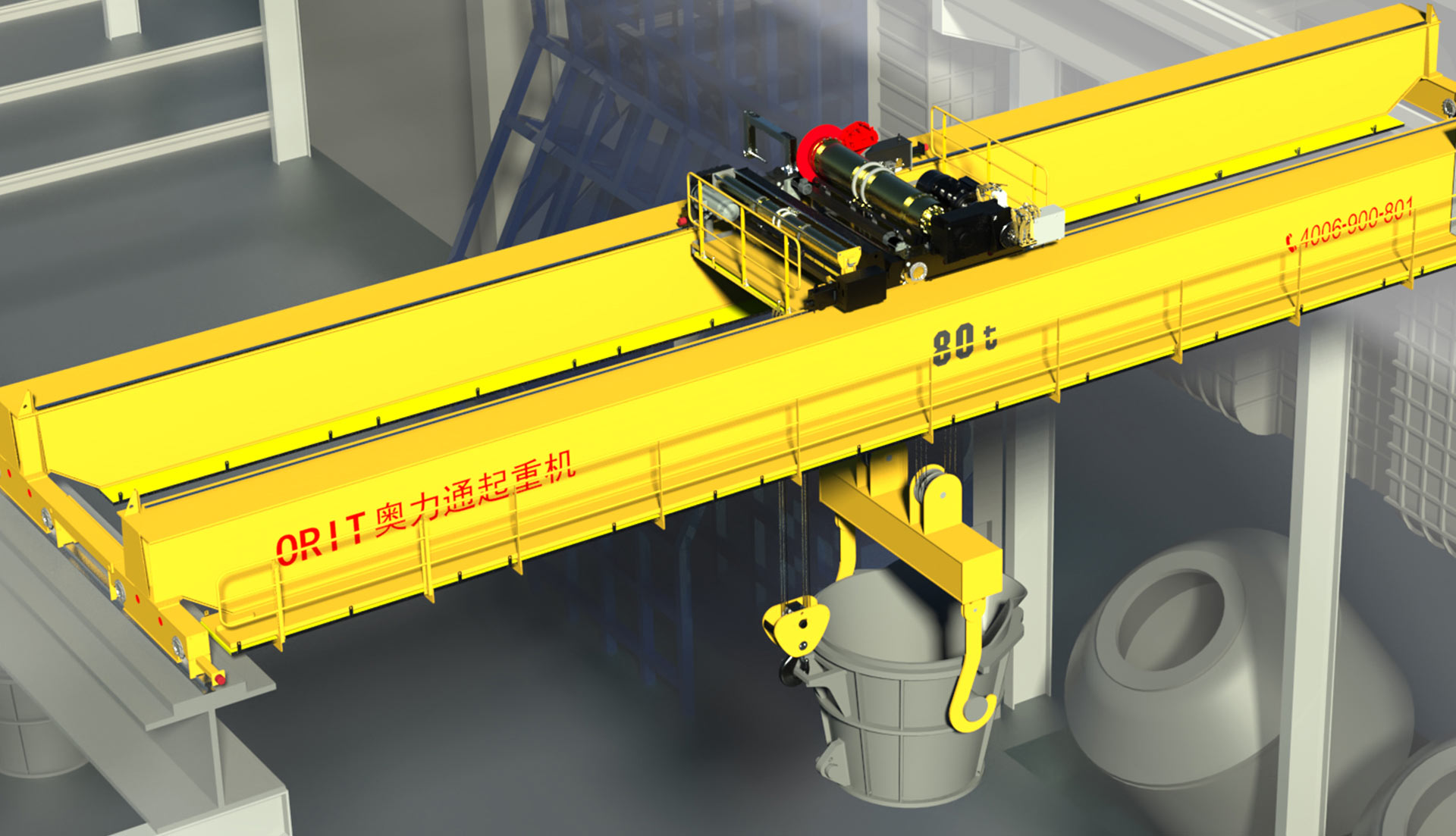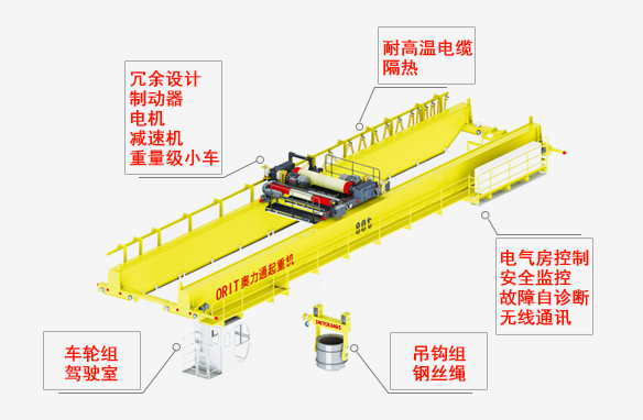 钢丝绳 冶金专用钢丝绳,高强、镀锌,耐高温 吊钩组 重级制月牙吊钩或吊梁板钩,耐高温,寿命长