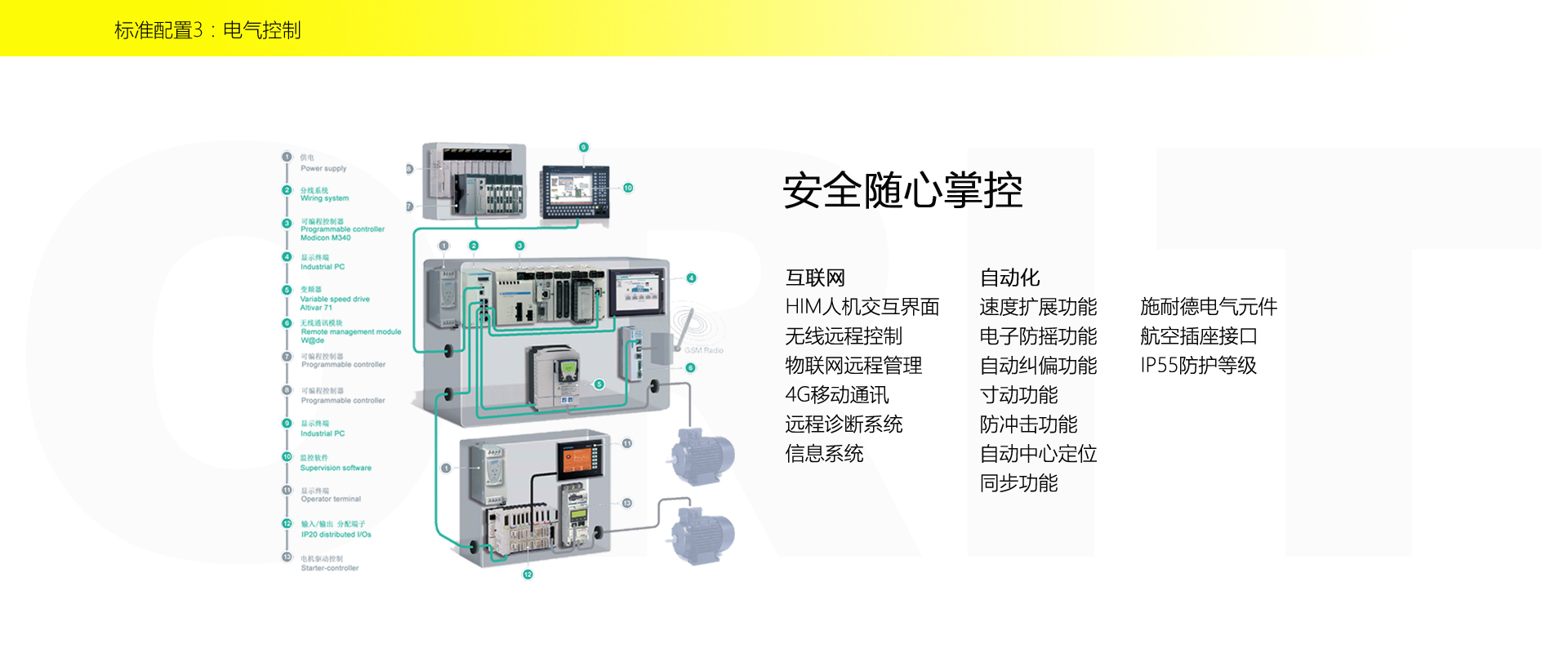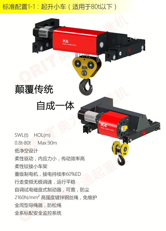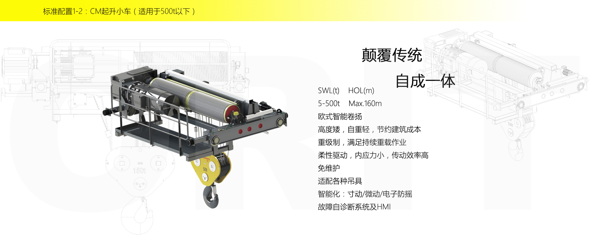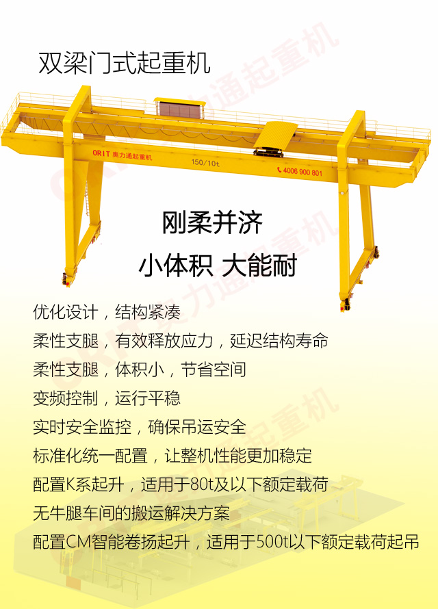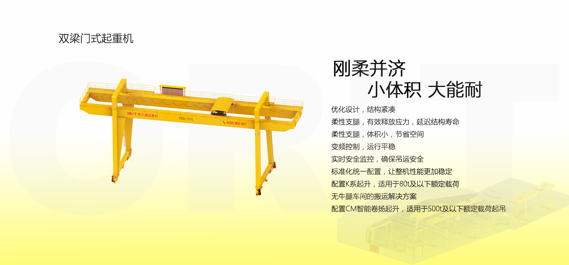 产品名称:双梁门式起重机 刚柔并济 小体积 大能耐 优化设计,结构紧凑 柔性支腿,有效释放应力,延迟结构寿命 柔性支腿,体积小,节省空间 变频控制,运行平稳 实时安全监控,确保吊运安全 标准化配置,让性能无比稳定 配置K系起升,适用于80t以下额定载荷 无牛腿车间搬运的最佳解决方案 配置CM智能卷扬起升,适用于500t以下额定载荷起吊 标准配置1-1:起升机构 SWL(t) HOL(m) 0.8t-80t Max.90m 低净空设计 柔性驱动,内应力小,传动效率高 柔性铰接小车架 重级制电机,接电持续率60%ED 行走变频无极调速,运行平稳 自调试电磁盘式制动器,可靠,防尘 2160N/mm² 高强度镀锌钢丝绳,免维护 全周型导绳器,防松绳 全系标配安全监控系统 标准配置1-2:起升机构 颠覆传统,自成一体 SWL(t) HOL(m) 5-500t Max.160m 欧式智能卷扬 高度矮,自重轻,节约建筑成本 重级制,满足持续重载作业 柔性驱动,内应力小,传动效率高 免维护 适配各种吊具 智能化:寸动/微动/电子防摇 故障自诊断系统及HMI 标准配置2:三合一驱动 静音科技,静享搬运 结构紧凑,铝合金壳体,密封 变频电机+硬齿面减速箱+盘式制动器 三合一集成化设计 全变频调速 最高转速4800 r/min 防护等级IP55 半油脂润滑,免维护 静音科技,静享搬运 标准配置3:电控系统 安全随心掌控 互联网+ HIM人机交互界面 无线远程控制 物联网远程管理 4G移动通讯 远程诊断系统 信息系统 自动化 速度扩展功能 电子防摇功能 自动纠偏功能 寸动功能 防冲击功能 自动中心定位 同步功能 智能安全监控器 计算起升机构剩余安全工作时间 累计起升工作时间 累计超载次数 累计起升电机启动次数 起升电机过热保护及报警 刹车片厚度报警 ... ... 远程通讯 施耐德电气元件 航空插座接口 IP55防护等级 标准配置4:端梁 多变灵活,适应自如 模块化直驱设计 自重轻、体积小 重型端梁,组合形式多样,满足不同承载需求 柔性连接,均分轮压 防出轨装置 集中润滑装置 车轮纠偏装置 柔性支腿 刚柔并济,轻巧强悍 一侧刚性支腿,主端梁直接螺栓刚性连接 一侧柔性支腿,主端梁通过铰座柔性连接